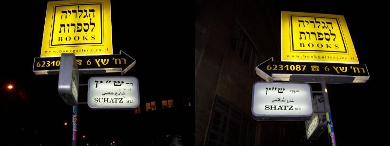 These signs were back to back. Another instance of this is Jaffa Street is also sign posted as Yaffo Street. Looking on a map (on paper or off google maps) spellings of road name vary wildly which can really confuse tourists. Seems different English translations of Hebrew words are quite common. Moshiach (Hebrew for Messiah) can also be spelt Mashiach or possible other ways as well.