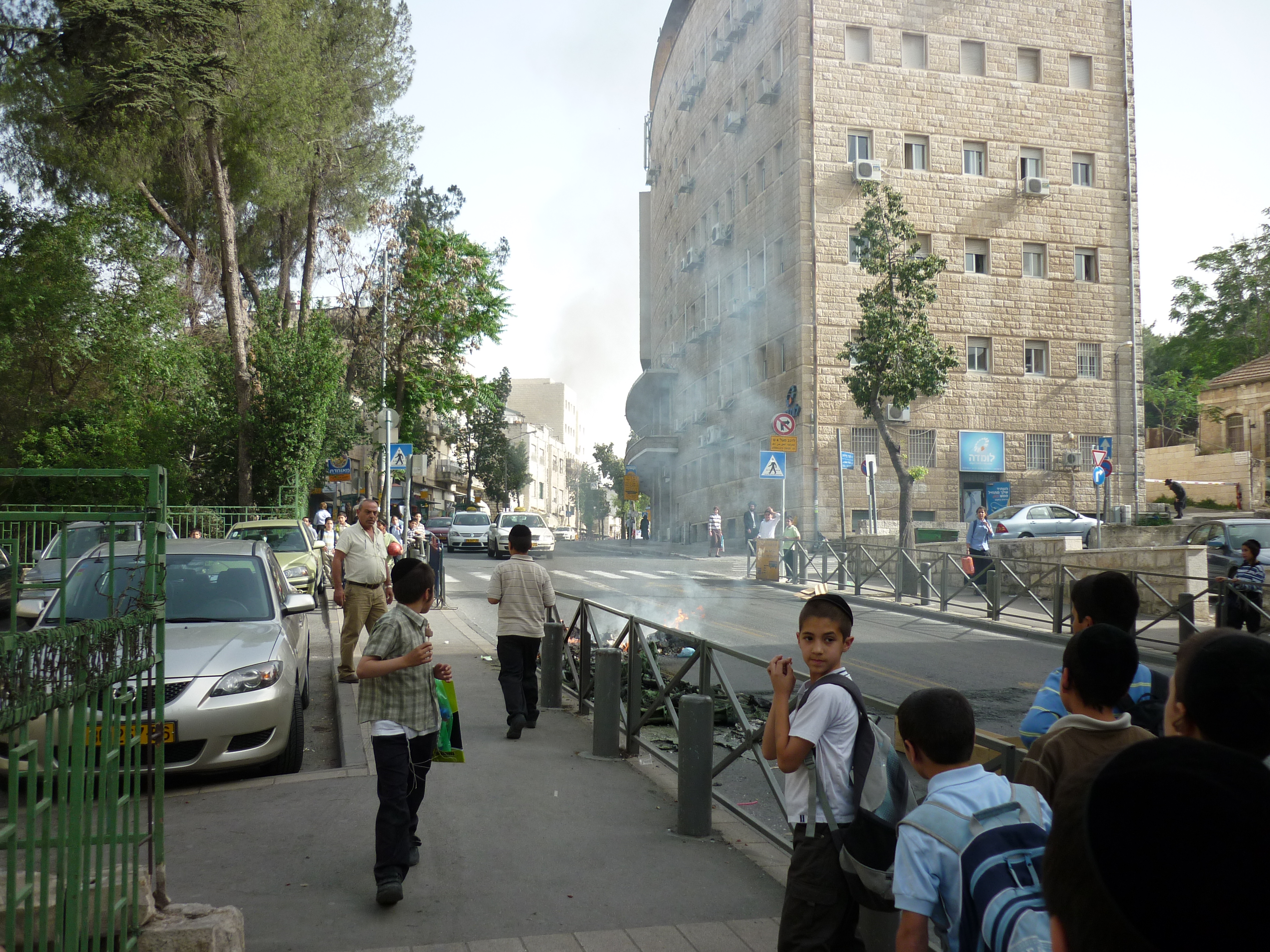 The Haredi community (Ultra Orthodox people) which live in this part of town seem to have got upset about something (usually that government had said or done)  had decided to burn some rubbish bins, hence the horrible smelling melted green plastic still burning in the road.  I didn’t see any people that looked like they were angry or holding cans of petrol or whatever as it seems they had already fled.   Seeing as I blogged before about Arab community burning bins, maybe setting fire to garbage is becoming a national sport or something?